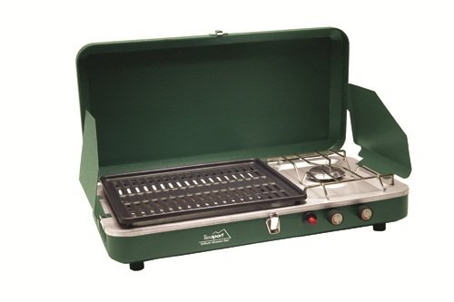 With the Texsport Insta-Light Propane Stove and Grill, the conveniences start with a match-free lighting mechanism. Simply turn on the gas, press the electric starter, and you're cooking in minutes on the 13-by-10-inch (W x D) grill surface and 10,000 BTU side burner for a fry pan or pot. The metal socket injector fits both 16.4- and 14.1-ounce propane cylinders, and the grill will run for a full two hours on maximum heat.